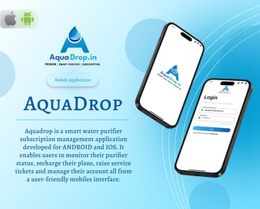 AquaDrop is a modern mobile app designed for water purifier service providers. This application helps users easily manage their purifier subscriptions, track status, and raise service tickets—all in a clean, user-friendly interface.